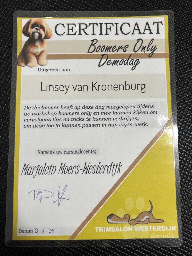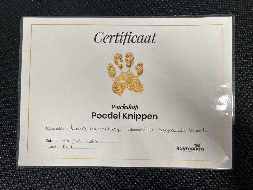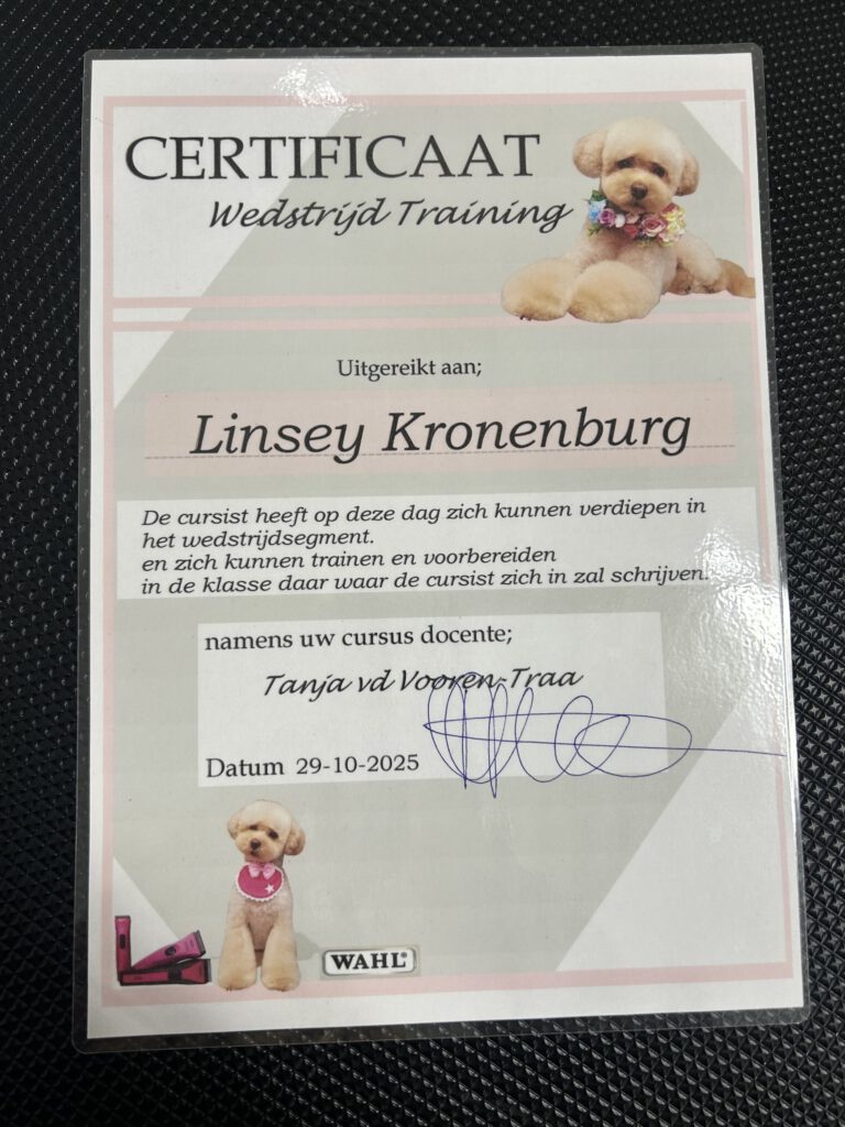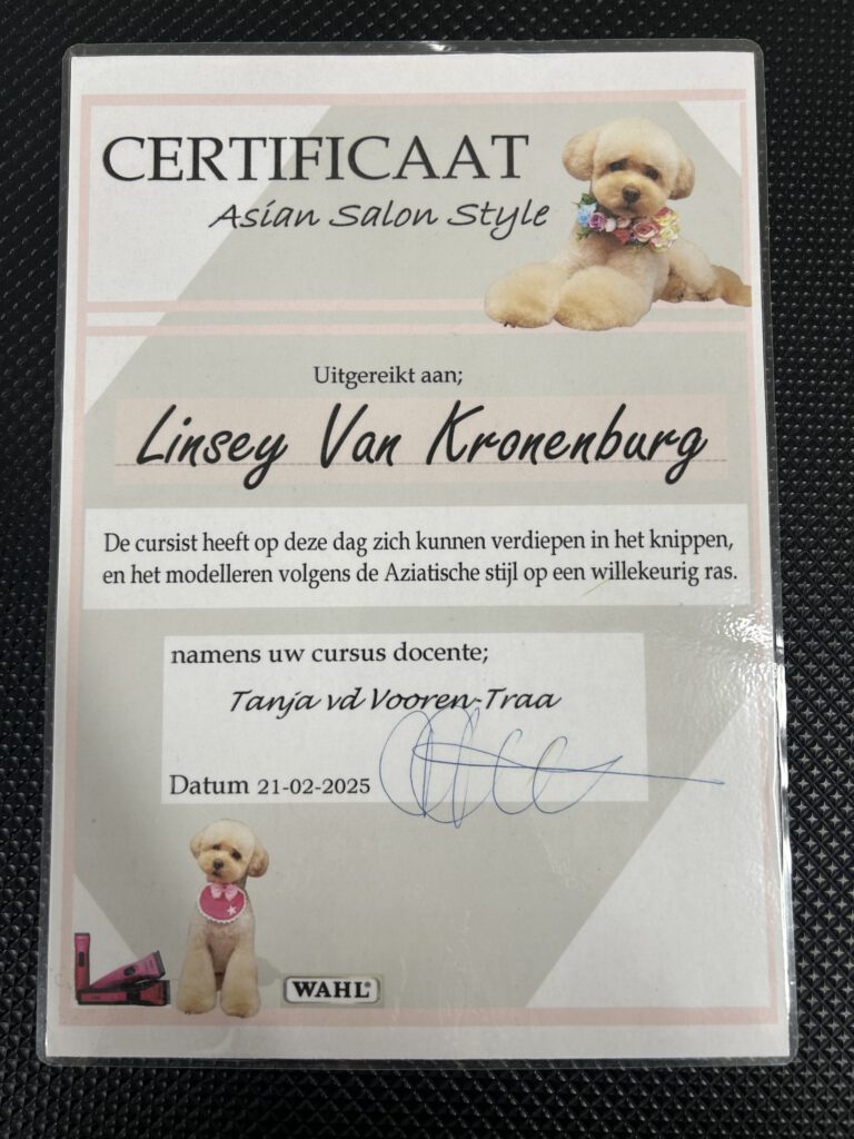 Mijn hele leven ben ik al gek op dieren, en op honden in het bijzonder. Als kind groeide ik op met vier honden, meerdere boerderijdieren en knaagdieren. In 2023 besloot ik mijn passie te volgen en begon ik aan de vakopleiding Hondentrimmen bij het Huisdier Kennis Instituut in Bunnik. Daar behaalde ik later ook mijn diploma als gediplomeerd hondentrimmer.